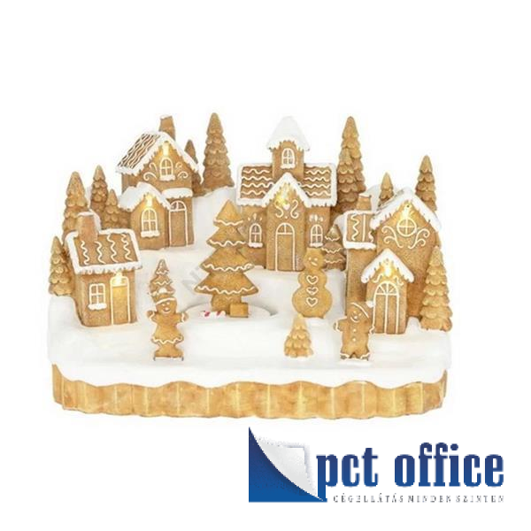 Mézeskalács falu mozgó fenyővel, LED-es poly 24,5x16x16,3cm barna, fehér