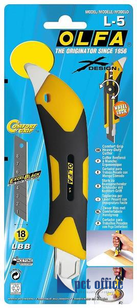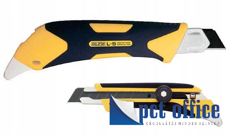 OLFA L-5 - 18mm-es standard kés / sniccer. Az X Design sorozat nagy igénybevételre tervezett csavaros pengerögzítésű tagja. Üvegszállal erősített markolata végén erős fém fül található.