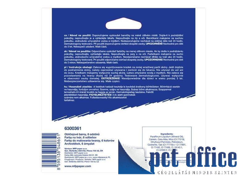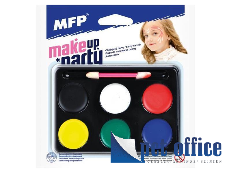Arcfestékek. A készlet 6 színt tartalmaz: piros, fehér, kék, zöld, sárga és fekete. Az arcfestékek dermatológiai tesztelésen voltak. A készletben van 1 kis ecset.