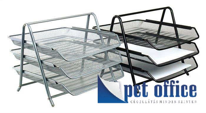 Fémhálós kivitelű háromszintes irattartó tálca, A/4 -es méretű iratok tárolására. Színek: fekete, ezüst.
