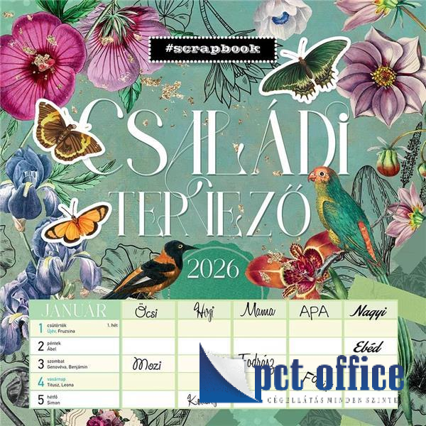 30x30 cm méretű, képes falinaptár (lemez), 12 hónap, ünnepekkel, névnapokkal, irkatűzött, 28 oldal, lyuk az akasztáshoz, 300x300 mm