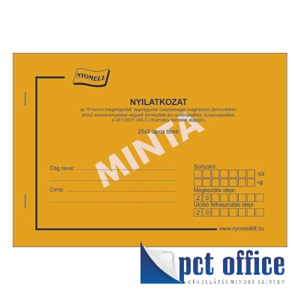 D.G. NYILATKOZAT (10 TONNA MEGENGEDETT LEGNAGYOBB ÖSSZTÖMEGET MEGHALADÓ JÁRMŰVEKKEL...), 25x3 PÉLDÁNYOS, SORSZÁMOZOTT, A/5