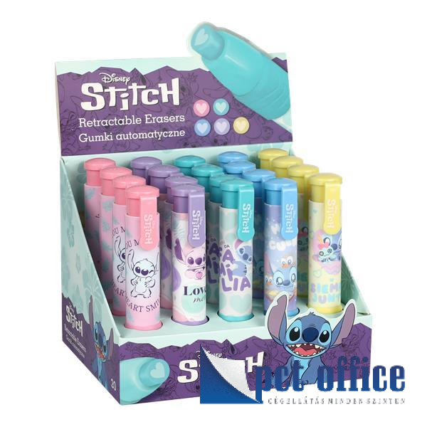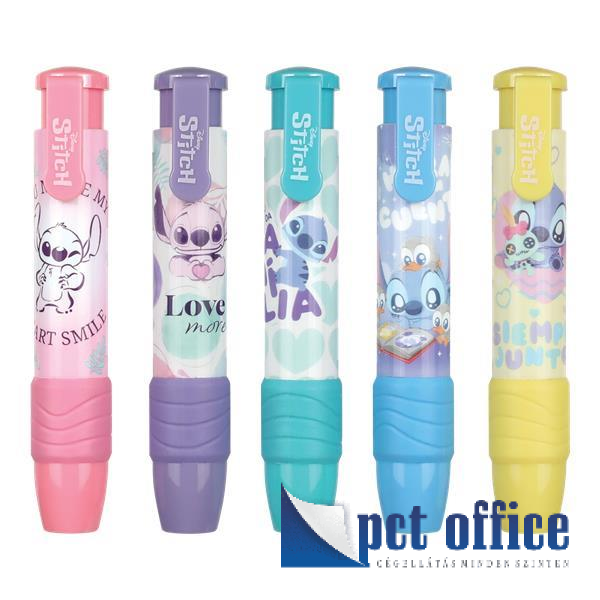 Praktikus visszahúzható radír tollszerű kivitelben, aranyos, vidám, mosolygós Stitch mintákkal.
