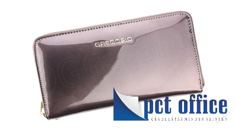 Elegáns lakkpénztárca dupla körcipzárral, sok kártyatartó hellyel. Az egyik cipzárral nyílik egy két rekeszes papírpénztartó; itt a cipzárral nyíló aprópénztartó rekesz is el van helyezve. A másik cipzárral nyílik a kártyatartó része, hova össz.13 db kártya és 2 igazolvány elférnek.